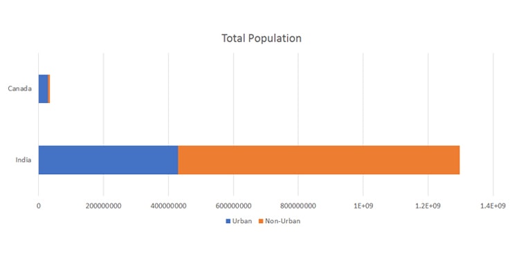 In Canada, 83 per cent of the population live in urban centres compared to 33 per cent in India, according to Statistics Canada and UN World Urban Prospects.