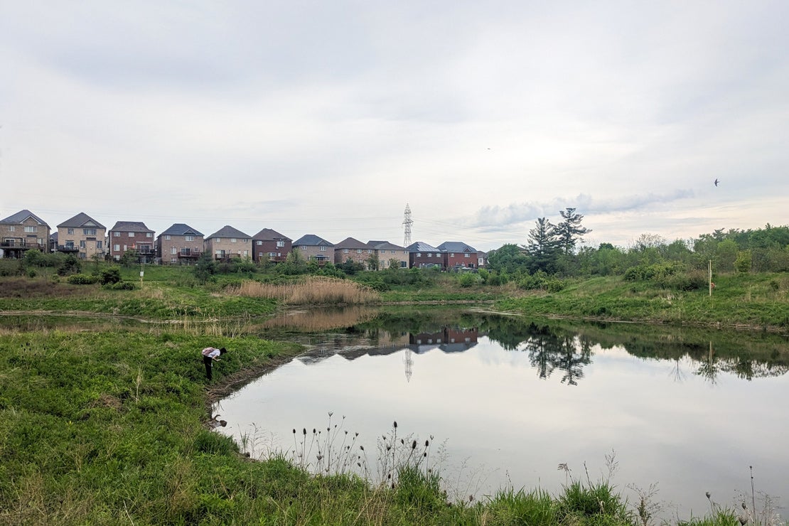 Stormwater ponds such as this one in Brampton, Ont., are designed to prevent flooding and protect local waterways, but have become home to bird species and other wildlife (photo by Kaylie Borntraeger)