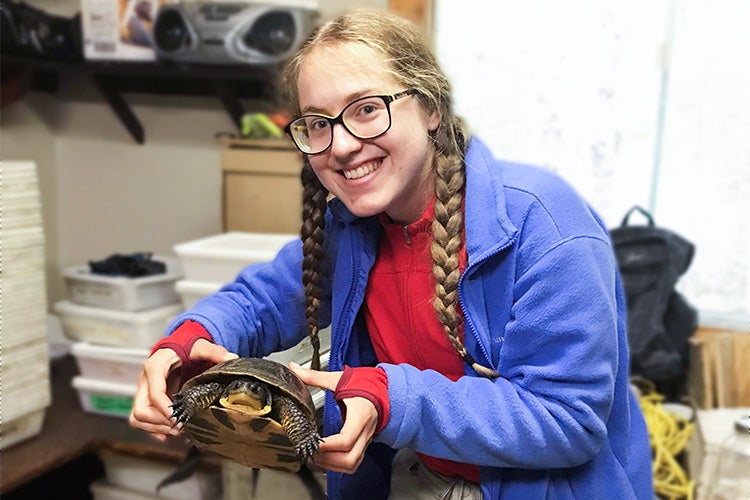 Hayley Vlcek, an Innis College student, holds a Blanding's turtle in the lab at the Wildlife Research Station in Algonquink Park (photo by Jessica Leivesley)