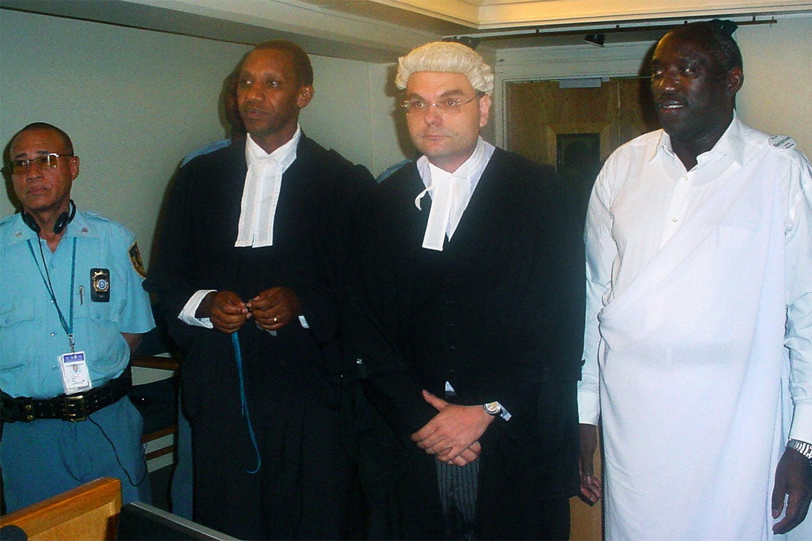 Simon Bikindi, right, a Rwandan singer-songwriter, is pictured with his lawyers and a United Nations guard at the International Criminal Tribunal for Rwanda in 2008 (photo by STR/AFP via Getty Images)
