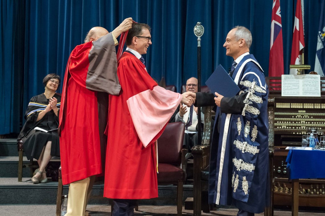 Dr. Michael Dan shakes the hand of U of T President Meric Gertler at Thursday's convocation ceremony, where Dan received an honorary Doctor of Laws, honoris causa (photo by Steve Frost)