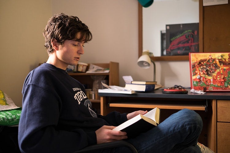 Greg Venizelos, a first-year student from Connecticut, studies in his dorm room at Sir Daniel Wilson Residence (photo by Geoffrey Vendeville)