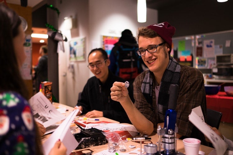 Dan Proctor, a third-year student majoring in economics and cinema, shows friends a button he made at a Christmas party at the University College Commuter Centre (photo by Geoffrey Vendeville)