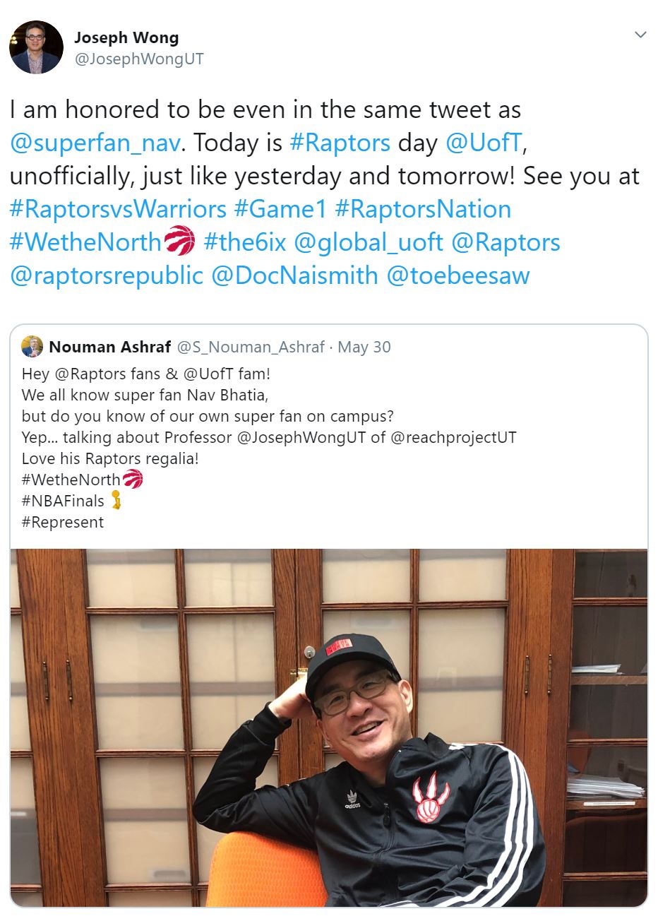 U of T’s Joe Wong rubs social media shoulders with Raptors “superfan” Nav Bhatia.