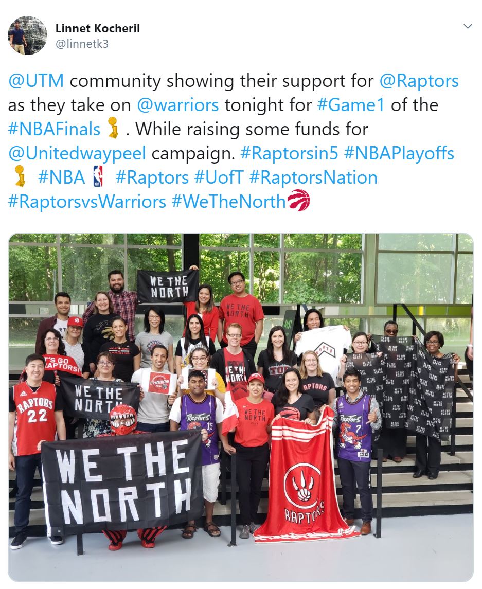 Students, faculty and staff show off their Raptors gear at U of T Mississauga.