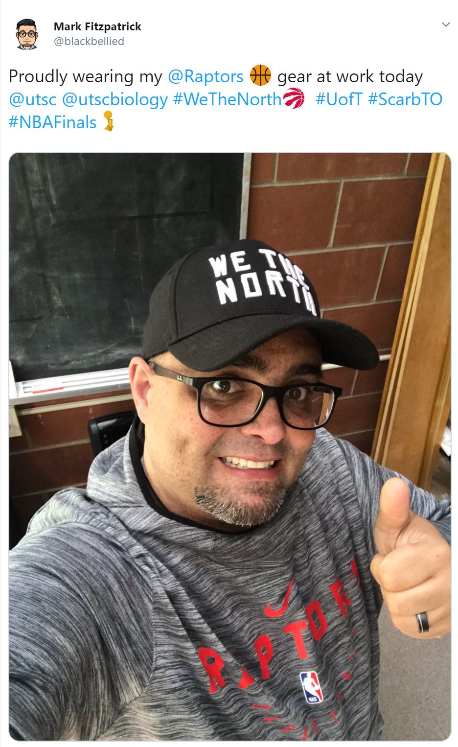 Faculty member Mark Fitzpatrick is decked out in Raptors gear at U of T Scarborough.