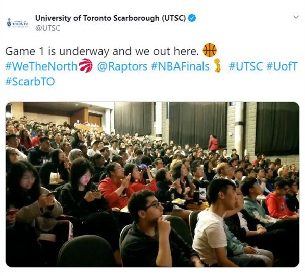 Students – as well as many faculty and staff – held viewing parties on campus and took to social media to celebrate as the Raptors defeated defending champions Golden State Warriors in the opening game, 118 to 109.
