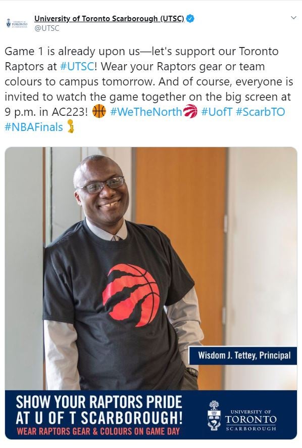 Wisdom Tettey, vice-president and principal of U of T Scarborough, added a Raptors tee to his wardrobe.