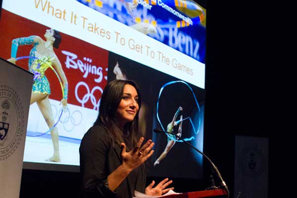 Orlando agreed, insisting that this kind of holistic preparation proved essential for her leading up to, and at, the 2008 Games. The world-class rhythmic gymnast who graduated from U of T's Woodsworth College in 2010 with a BA in political science, opened her presentation with footage of her routine in Beijing. Her athleticism and grace made it easy to miss that both ankles were heavily taped to support three torn ligaments in her left ankle and a serious sprain in her right.