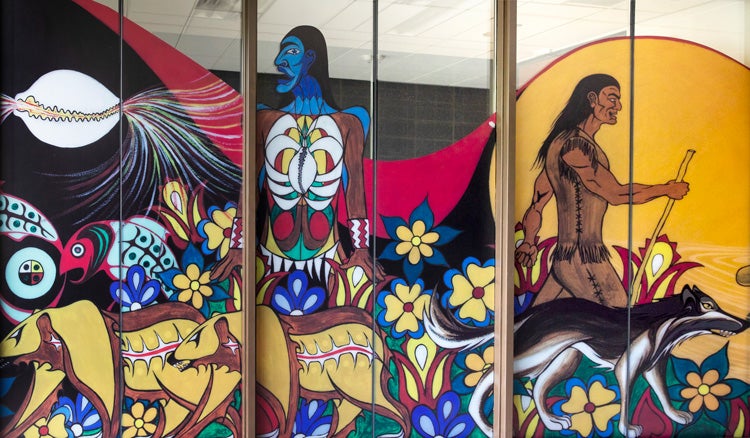 In the Maanjiwe nendamowinan building, U of T Mississauga is deepening its commitment to the Indigenous community and U of T’s Calls to Action with a new Mississaugas of the Credit First Nation Office, featuring a showpiece window treatment by a local indigenous artist.