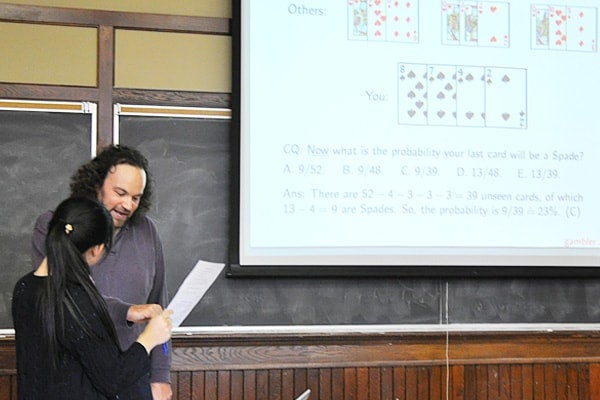 Rosenthal teaches a new statistics course on quantitative reasoning called Why Numbers Matter. It’s designed especially for humanities students who think they have no talent for mathematics or haven't taken it since high school. Some take it to fulfill a breadth requirement; others because they know quantitative reasoning is a handy skill. Rosenthal uses examples from all over, including music, poetry, lottery, politics, sports and gambling. He'll use a scene from Casablanca to discuss gambling or ask "who here owns music by the rapper Drake" when discussing representations in sample statistics.