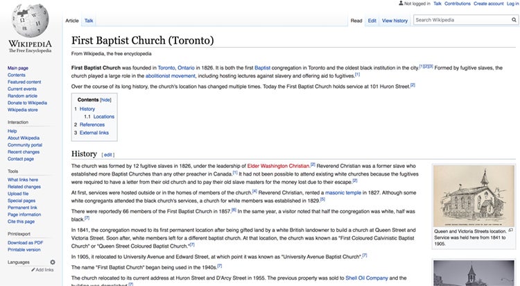 Participants in the U of T edit-a-thon added a Wikipedia page for Toronto’s First Baptist Church, which was formed in 1826 by fugitive Black slaves (screenshot via Wikipedia)