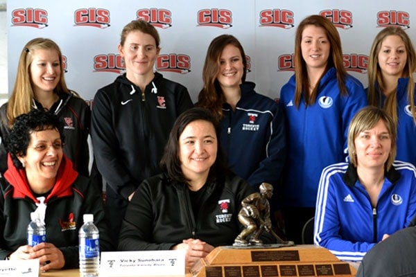 U of T’s Sunohara is competing against three former gold-medal-winning Olympic teammates now with the reigning champion Calgary Dinos: coach Danielle Goyette, assistant coach Kelly Bechard, and forward Hayley Wickenheiser.