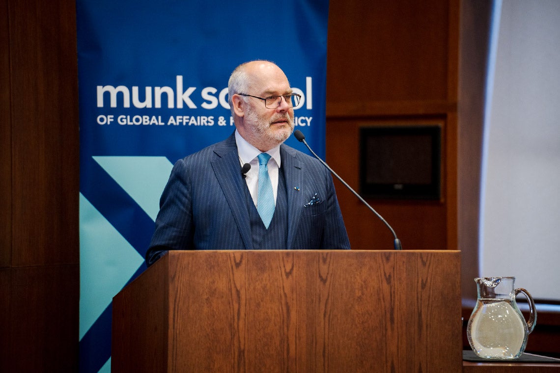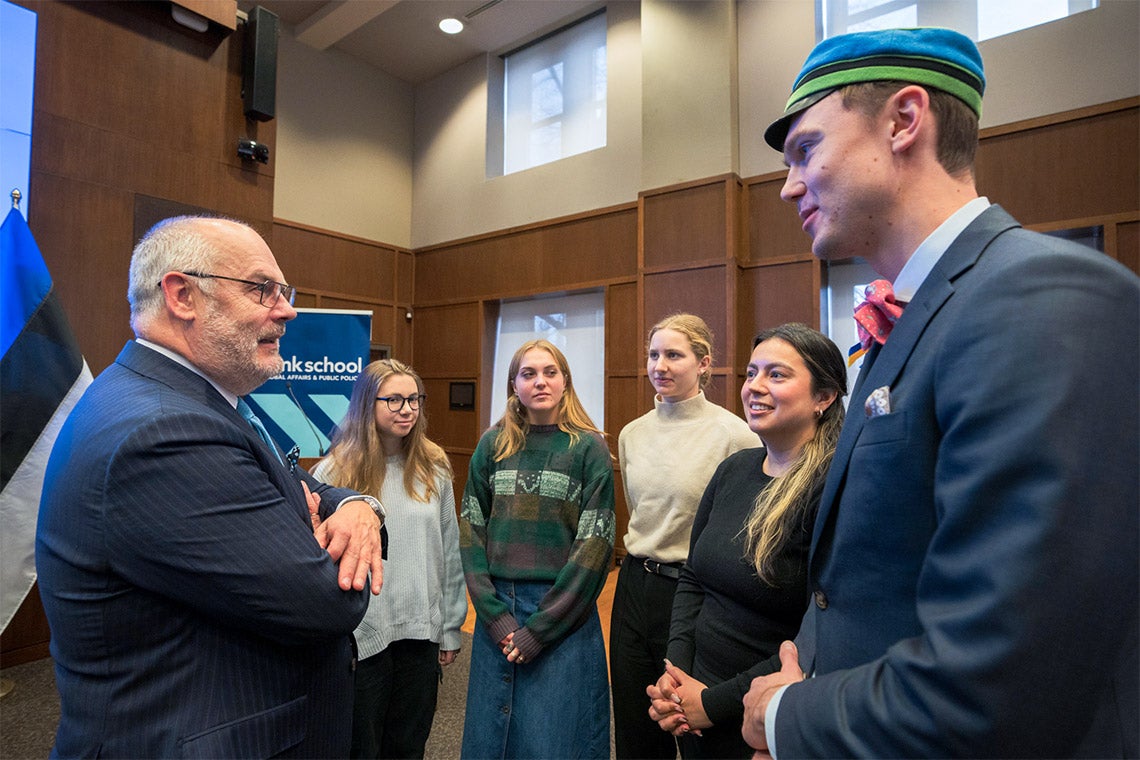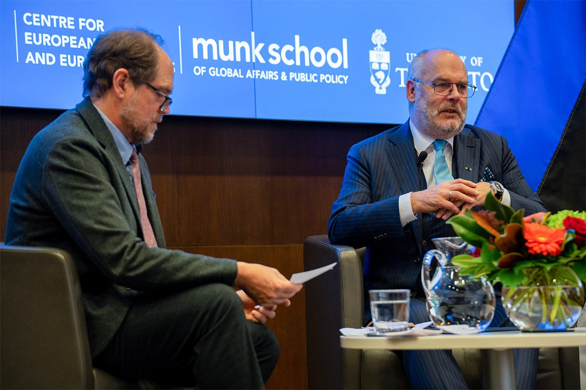 Karis spoke with an in-person audience of Munk School students and community members at the school’s Campbell Conference Facility. He was welcomed by Munk School Director Peter Loewen and took part in a lively Q&A moderated by Andres Kasekamp, Elmar Tampõld Chair of Estonian Studies at the Munk School and a professor in the department of history in the Faculty of Arts & Science.