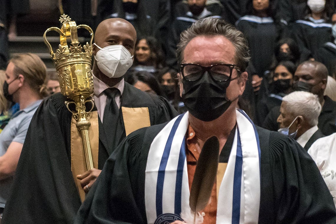 As a sign of the university’s profound respect for Indigenous communities and cultures, the Eagle Feather Bearer carries a ceremonial Eagle Feather into Convocation Hall at the outset of each convocation ceremony, followed by the bedel carrying U of T’s gold-plated mace.