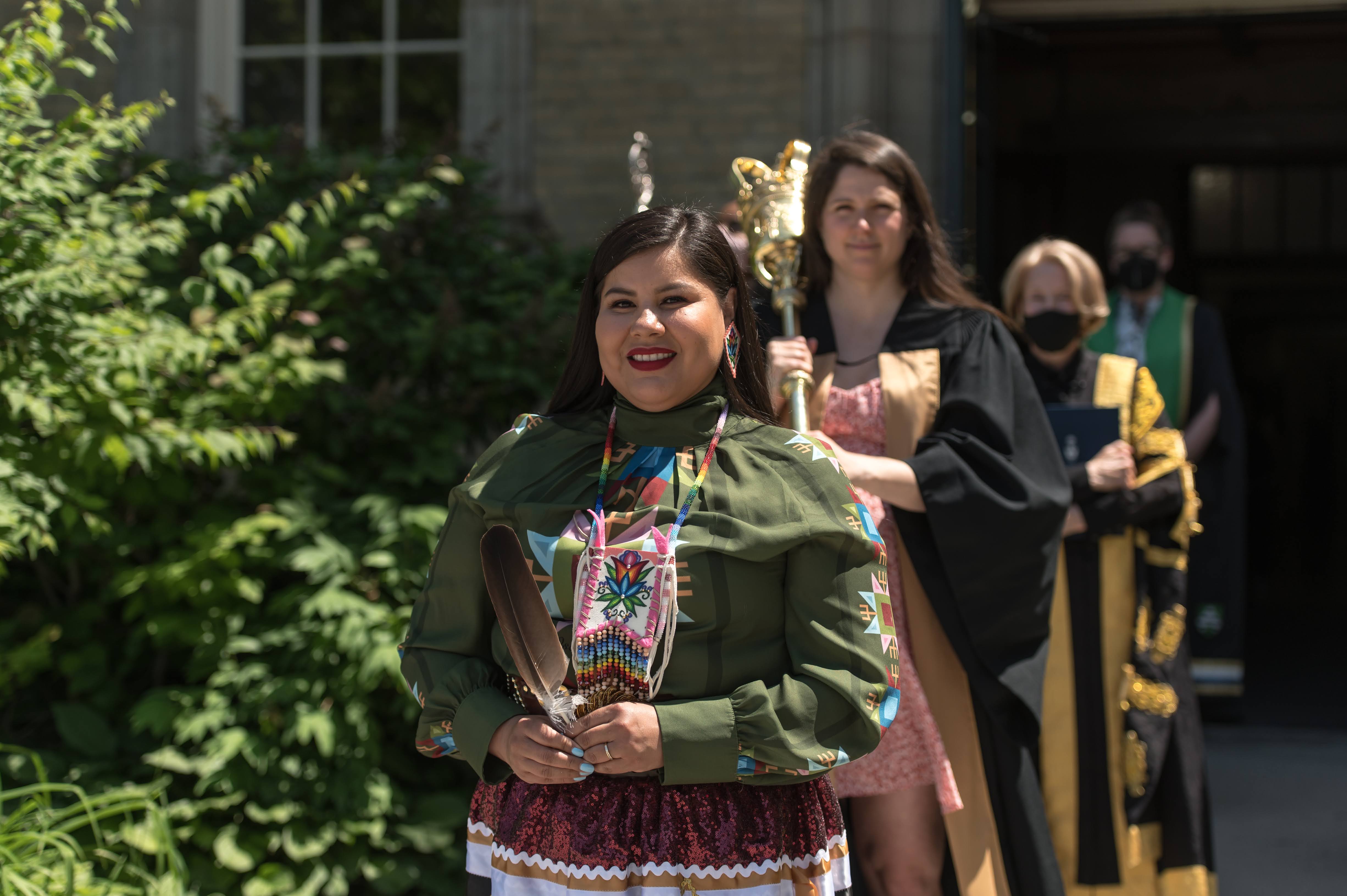 “I had a very positive experience. I thought the university was very supportive in adopting and honouring the Eagle Feather Bearer role within the ceremony. Leading the procession was symbolic of the presence of Indigenous Peoples on Turtle Island before all of this, even before the long history here at U of T.